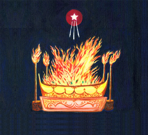 The cosmic Burning-ground of living fire lieth in the nethermost part of the western heavens. Its smoke riseth unto that high place where dwell the Sacred Lhas to Whom the triple Unity within our solar space tender Their offerings and Their fealty. Its scent of spices sweet and faint aroma of incandescent ... reach to the utmost confines of the starry vault. The Two arise and pass the essential Flame through Their burning-ground, blending Their lesser smoke with the greater. This smoke formeth a Path which reacheth forth unto those spheres within the radiant form of that Attractive Life, to Whom the sons of being and of men in all their many grades offer their prayers, their life and adoration. The Master on this sphere, which is known as the fourth and is not holy, seeth the fiery WAY; He respondeth to its heat and seeks to warm Himself within its waves of radiant fire electric. A centre at the midway point within the great Kumaric Body formeth the pyre. It pulsates and it glows. It becomes a sea of living fire and draws within itself its own. The smoke which issues from this fiery wheel formeth a living WAY, veiling the steps ahead. The Master — with the midway wheel on fire — enters within the smoke, and enters blind. He sees no step ahead. He hears no voice. He feels no guiding hand. Only the fifth and latest known aids Him to forward grope, and pass straight onward through the veiling clouds; only the awakening of His wheel may indicate His progress through the new magnetic field. Only the sons of ... (GEMINI) know the way in; only the sons with blazing fire, issuing from the midway point, may enter in. They throw their beams ahead to illuminate the WAY. The Adept of the funeral pyre, the Master of the blazing sphere consumes Himself. Offering Himself the One that is, the new-made threefold Word, the sacred OM, the fire of God, He treads the burning-ground, and blazes forth to those who watch as a radiant flaming sun. He ... and draws the people onward to their goal, warming their hearts, producing dual fire, and leading all towards the portal of the sun and thence to ... (GEMINI). The mystic Word is veiled by letters four — E, M, and A and O —. In the significance of their numbers and the utilisation of their colours is the smoke dissipated.