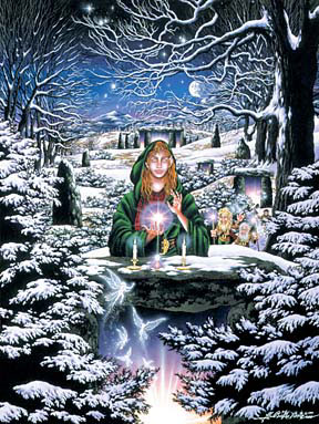 Christmas Many of us think that we have always celebrated our Solstice holiday, Christmas, in the way we do today ~ with a massive show of light. We illuminate Christmas trees, decorate our houses and gardens with strings of light, burn candles throughout our homes and logs in our fireplaces, and light up our city streets. What started as a holy mass in Europe, probably at the time assigned to the birth of Jesus (probably April) was moved back to the Winter Solstice by church fathers to serve several needs. The early church was in competition with the Pagan holiday of the Romans, the Saturnalia, which still exists in our New Year celebrations featuring Father Time ~ Saturn. They were also in hot competition with the Mithra Cult, a spinoff of Zorastrianism, which was a favorite of Roman soldiers. The Mithra Cult was devoted to worship of the sun, which comes down to us today in the Christian Sabbath day ~ Sunday. During the Dark Ages, as northern Europes pagans were converted en masse to Christianity, the church found it difficult to stamp out pagan practices that were dear to the new converts. The many gods and goddesses were converted to saints to whom a good Christian could pray, and even the most primitive totemic practices were absorbed into the new Christmas festival. The Germanic tribes worshipped the evergreen green ~ a symbol of eternal life ~ and the Druids, of what would later be France and England, revered the mistletoe, an oak parasite associated with fertility. We still believe it is lucky to kiss under some mistletoe. The Yule Log, the great log, making a brilliant fire in the hearth of the local lord, had its roots in another Druid custom: rolling a flaming wheel down a hill on Winter Solstice night, to show the sun how to come back. This flaming wheel ceremony is still found in remote parts of Europe. Now, what about the symbolic significance of light? The more sophisticated worshippers in the past always recognized that light is associated with wisdom. Being "in the dark" of living in darkness has always meant ignorance and the twin of ignorance, fear. Being illuminated or having a luminous soul means understanding the true meaning of life. Part of the Christian lore of light at this darkest time of year has always meant living in Gods light. The traditional foods of Christmas also have great symbolic meaning. The fruitcake originated during the Crusades when the European soldiers sent home the wonderful dried fruits of the Muslim East. The custom of putting "sugar plum" in the stockings of good children also dates from the Crusades.