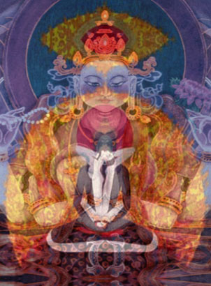 column is dedicated to exposing myths about love-making Heaven on Earth now! Tantra, from the Sanskrit word for fabric, is an ancient term that embraces a wide range of ideas and practices variously associated with Harrapan, Hindu, Buddhist and Taoist belief systems. In its broadest sense, tantra refers to a spiritual path that seeks direct spiritual experience through meditation, the use of ritual sacraments and sometimes, ecstatic sexual practices. In essence, the physical world is seen as reflecting the greater cosmic order, and enlightenment is taught to be as readily attainable by direct experience of the material world as by the practice of monastic asceticism. Tantric yoga teaches that spiritual unity with the divine can be achieved in union with a partner. The physical act of love thus becomes, both figuratively and literally, an act in which the dualities of spirit / matter, mind / body and self / other are transcended. Perhaps the finest expressions of this longed-for state of blissful transcendence occur in the Yab-Yum (male principle-female principle) drawings that abound in tantric art, here represented in the Amitayus (Buddha of Long Life) and Kuntozangpo (Primordial Buddha) images. Tibetan thangka paintings are two-dimensional images of multi-dimensional worlds that depict the many deities and their various spheres of influence. Beautiful artworks in their own right, they also serve, to the initiated, as mnemonics that map the esoteric coordinates of the physical, psychological and spiritual planes. Authentic transmission of the truths hidden within these images was only assured, over time, by the codification of complex symbolic systems handed down by generations of dedicated artists. Underlying each sinuously swirling image is a mathematically precise grid defining the exact arrangement of every element in the composition. Each angle, each colour. each object, fulfills its predestined place in a grander design, and the glory of the creation of expression lies in cleaving as closely as humanly possible to an ineffable ideal.