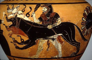 The Symbol of Cerberus The three-headed dog Cerberus with a terrific bark, with snakes growing out all over his body and with snakes for a tail, was the guardian of Hades. The three heads symbolize sensation, desire and good intentions. It is love of sensation that drives humanity hither and thither to satisfy hunger in the economic world or to satisfy desire for happiness in the world of pleasure. The violent impacts of sensation are sought to keep the mind occupied. The central head was grasped by Hercules first because it was the most important, since desire underlies all sensations; it is what desire seeks to express and so gain satisfaction in the outer world. The third head is good intentions, not carried out. So you have desire in the center, on one side you have sensation typifying all impacts, and on the other side the third head of good intentions not thought through, never performed, of which it has long been said: "Hell is paved with good intentions". The tail made of serpents typifies all illusions that impede the progress of spiritual life; the materiality that holds us down; the lower psychic nature that causes such destruction; fear along every possible line; the fear of failure which holds so many back from activity and breeds only inertia, the great fault, we are told, of aspirants and disciples. Hercules grasped Cerberus by the central head and conquered him, because all sun gods are occupied with the problems of humanity and because desolate they go down into hell alone to save humanity; hence all sun gods are born in the sign of Capricorn.
