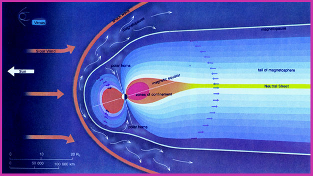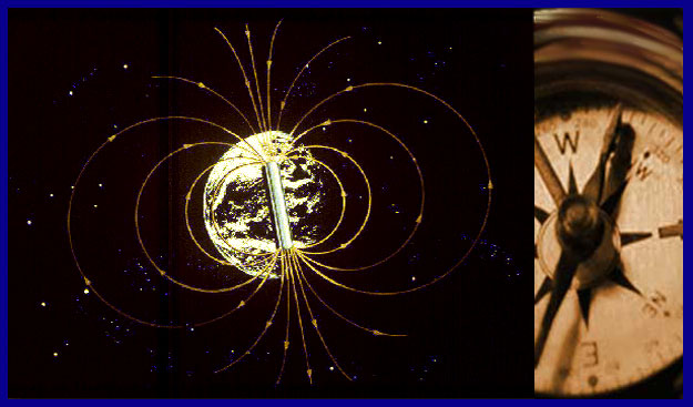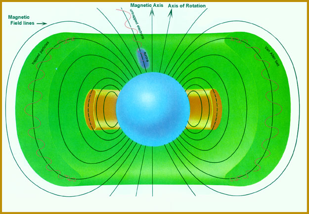 Among the changes that may await planet Earth in the relatively near future is a reversal of the orientation of its magnetic field, so that the north end of a compass needle would now point to geographic south. The geographic record indicates that many such reversals have occurred in the past and another flip-flop may be underway. Some scientists proclaim that we are already overdue for one. Intervals between these reversals are quite irregular, ranging from 35 million years to several thousand years. The last known polarity reversal was some 730,000 years ago. During the past 150 years, the earths magnetic field has declined in strength by 10 percent. At this rate, a field reversal could occur in approximately 1500 years. Even with our present technology, it is difficult at best to predict these events. In periods of heightened solar activity, such as the times of solar flares ~ which can increase the sun's radiation tenfold ~ the sun releases streams of highly energetic particles called solar cosmic rays. These cosmic rays have been linked to the formation of nitrogen oxides, which in turn can cause partial destruction of the earth's ozone layers. It is the ozone layers that normally prevent harmful ultraviolet rays from reaching the surface. The earths magnetic field originates deep within the planet through complex interactions between its outer core ~ a thick fluid layer of molten iron alloy, its inner core ~ solid iron, and its rotation, producing a planetary dynamo. The earths magnetic field extends thousands of miles into space, forming a kind of cosmic cloak. The field is typically represented as lines of magnetic force that loop out from the physical South Pole and re-enter at the physical North Pole, forming the magnetosphere of the Earth. The magnetosphere is shaped by the pressure of the solar winds and generally maintains an overall bullet shape, blunt on the planets sunward side and then streaming out behind, forming the magnetotail. [ return to top ]