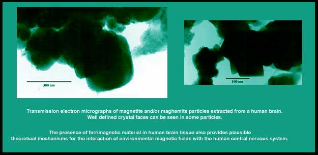 During studies of bacteria that always face north, it was discovered that these tiny organisms contained a chain of tiny magnets, actually crystals of the naturally occurring magnetic mineral magnetite, or lodestone, as it has been called by ancient peoples. Further research determined these crystals to be present in the brains of whales, homing pigeons, dolphins, even salamanders, and we now know they are present in almost all types of living organisms. Several conculsive tests with homing pigeons found this mineral tells the bird's brain the exact direction of the earth's magnetic field. The pigeon then uses this information to navigate with amazing precision. Because the magnetic crystals are extremely tiny, they eluded scientists looking for them in humans. However, with the help of the electron microscope, magnetite crystals were indeed discovered in human brains. Biologists feel the particles probably play an orientational role and feel their discovery could help explain the link between cancer and the electromagnetic fields produced by power lines and appliances. There is now persuasive evidence that under certain circumstances, power frequencies like those from electric transmission wires can produce a variety of changes in biological systems. Many researchers now call for the prudent avoidance of unnecessary exposure to manmade magnetic fields. [ return to top ]