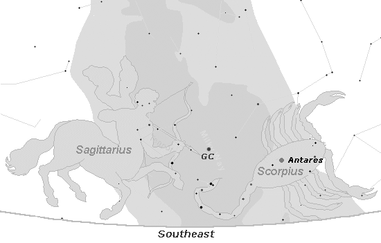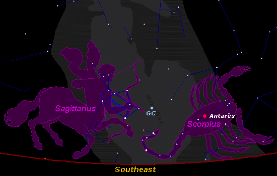 Review map above for the location of Sagittarius, the Galactic Center (GC) and Antares in the constellation Scorpius. Use "Back" to return here. Each year Goodwill's "Galactic" Moon journeys through the bulging heart of our galaxy. During this transit the Moon first conjoins Antares and then our Galactic Center (GC). The Sagittarius the Archer aims his arrow toward the heart of our Milky Way Galaxy (GC) and red Antares, the transformative heart of the cosmic Scorpion, Scorpius. Sagittarius sees the vision for humanity and knows the way to go, toward the all-inclusive galactic heart, toward transformation and goodwill – the qualities of the 5th Spiritual Kingdom, which lead to the evolution of the 4th Human Kingdom so that all Children of God may celebrate.