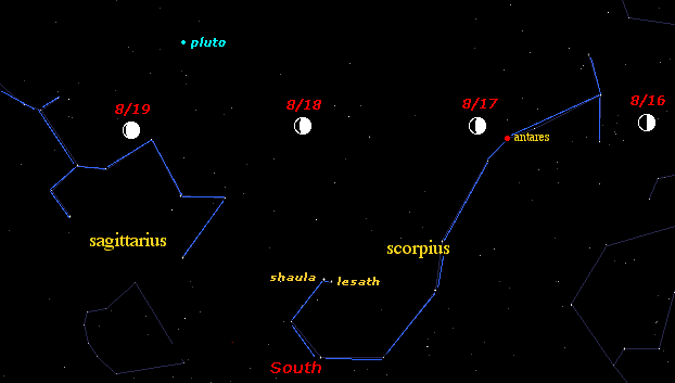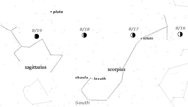 Meditations August 15, Sunday, Luna lies below the missing claws of Scorpius, the two brightest stars of Libra the Balance. Map/Text Hmmm ... the missing claws have become Libra's razor edged path, which demands a poised equilibrium between spirit and matter. Ponder the Libran Way, a right use of opposites that dissolves our differences.