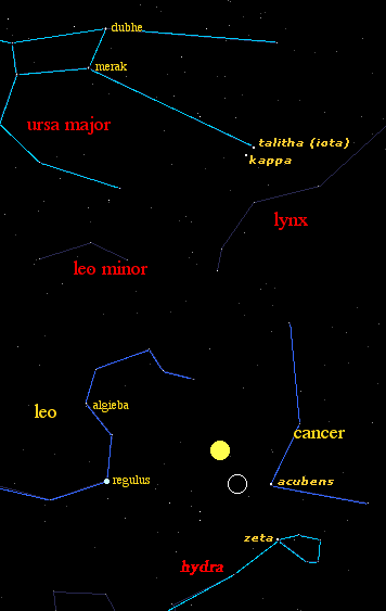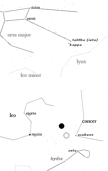 Reflections ~ New Moon With every New Moon our soul goes into meditation and aligns with the inspiration of the Nirmanakayas; a potential is enlivened and a seed of consciousness is formed deep within. Take some time to create a sacred space. A new cycle is beginning The New Moon aligns with Talitha of the Great Bear, Acubens of Cancer the Crab and the Zeta star of the Hydra. All these celestial bodies are located in a "near same" longitude. Review the map above.