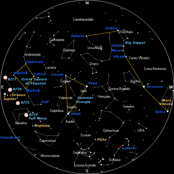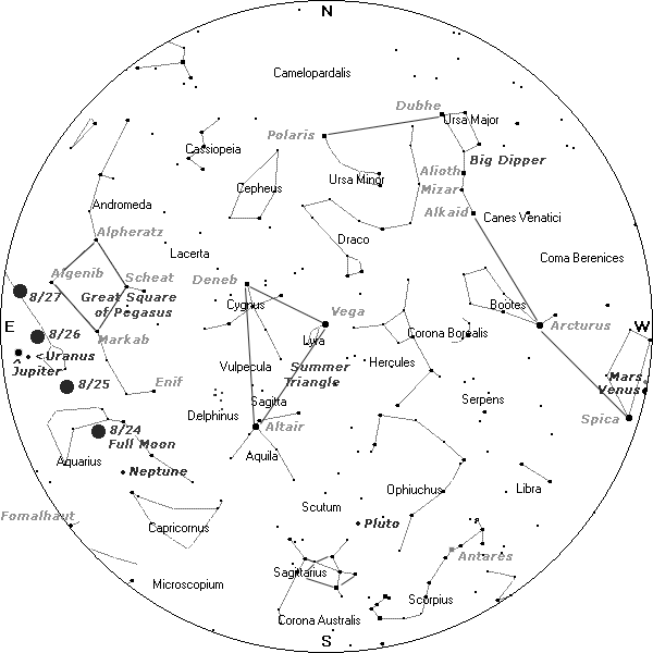 ~ Waning Gibbous Moon, Ideally the waning Gibbous Moon is a time that readies us to manifest anew. It brings illumination to the influences of the entire lunar cycle. If not, dis-ease results. Luna, Jupiter and Uranus are located in Pisces, the constellation of the World Savior. See this 8/26 11:30pm Map and review the Sky Chart Above. The stars of this dim constellation can only be seen in a dark sky on a moonless night. It is interesting to note that Pisces, lies beneath the Great Square of Pegasus, which the ancient Babylonians called "The Doorway to Paradise." Today astronomers travel through this doorway or "window" to the edge of our Milky Way Galaxy and go beyond to other galaxies!. Likewise, the Doorway to Paradise opens and new dimensions of reality are experienced, when the Light of the World, the World Savior, frees humanity from subservience to the form, ending forever the darkness of matter. These celestial energies are reminding us of the Christ consciousness, humanity's essential divinity, the awakened heart and soul. Jupiter is brilliant and illuminating in this celestial position, for it is the brightest light in the morning sky and also in the evening sky after Venus sets. The giant planet is ultimately bound to be light for our world, expanding our hearts and minds. The call to humanitarian service is strong with Jupiter in Pisces. In this location Uranus also sheds its light upon our world by surprisingly shifting humanity into a new reality with new visions of the greater whole, freeing us from the outdated, limited form-life. Jupiter's easterly prograde motion brought it into conjunction with Uranus June 8 and now its westerly retrograde motion (7/23-11/17) is moving Jupiter back toward Uranus for an exact conjunction September 18.