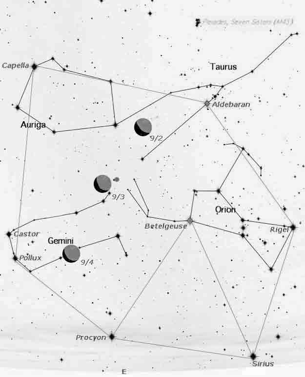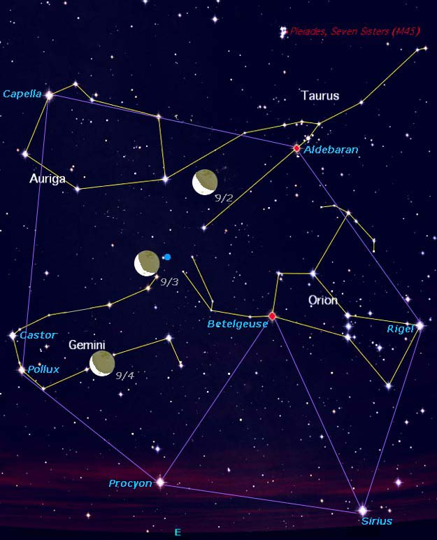 September 4, Saturday, the thinning Moon rises around 2:30am. It lies to the right (south) of Pollux in the constellation of the Gemini Twins. The cosmic Twins though opposites, Castor representing the form and Pollux the spirit, innately cooperate for the benefit of the whole. These aligned celestial bodies affirm that our present world of dualities and differences can offer opportunities of compassion and cooperation, which in turn lead to heartfelt expansions of consciousness. Imagine humanity with hearts ablaze dissolving differences and giving birth to the New Earth.