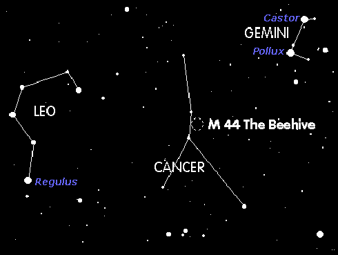 Reflections ~ Last Quarter Moon The Last Quarter Moon can bring a crisis in consciousness as the Moon squares the Sun. This cycle's experiences have culminated and one must now prepare for rebirth by initiating change. This lunar phase is exact October 30 at 5:46am PDT (12:46 UT). October 30, Saturday, Last Quarter Luna conjoins the Beehive Star Cluster (M44) at the heart of Cancer. Compare this map, showing the location of the beehive, with the map above. Moonrise: Midnight (12:00am 10/30) Cancer reminds us that life is beyond the form experience. We are of the spirit and belong to its everlasting life. Cancer urges us to reorient ourselves toward this life, to aim the arrow of the mind away from the astral currents of the mass consciousness toward the intuition. Cancer encourages us to listen to and trust our inner compass and guidance, to sense right direction and initiate the changes that nourish the spirit and soul. The emanations of Cancer help us build a lighted house wherein Life dwells. The Beehive reminds us we are not alone. We are part of a group soul, humanity emerging from darkness into the Light. Initiate changes with the above in mind.
