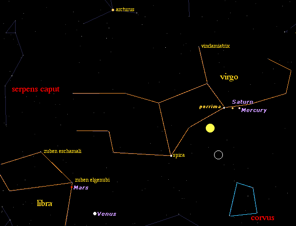 Reflections ~ New Moon With every New Moon our soul goes into meditation and aligns with the inspiration of the Nirmanakayas; a potential is enlivened and a seed of consciousness is formed deep within. Take some time to create a sacred space. A new cycle is beginning. The new lunar cycle begins in the constellation of Virgo the Virgin, our celestial chalice. The emanations of Virgo nurture our innate divinity, spiritual awareness and Christ consciousness until it can be made manifest, ultimately giving rise to the HU-man *, the God-man, the Christed ONE. The Sun, Moon, Saturn and Mercury are all found in Virgo the Virgin as this lunar cycle begins. Review map above. Each of these celestial bodies is creating a pathway for the manifestation of divine energies. The Sun in Virgo bestows the forms that demonstrate a consciousness having a greater sense of the whole. The Moon, when located in the Virgin, awakens within us a great potential toward world service. Mercury anywhere in Virgo allows the Divine idea to take root and gain strength, until it is born into the world. Saturn positioned anywhere in Virgo the Virgin conceives the structures that exteriorize the unfolding Christ consciousness. The Sun and Moon, Virgo's stars Porrima and Vindemiatrix, as well as the planets Saturn and Mercury line-up longitudinally. Review map above. Porrima, named after the goddess of childbirth and prophecy, emphasizes new beginnings and the use of guiding intuition during change and its birthing process. Vindemiatrix the Harvester is about exact timing and fruition. Mercury the messenger of the gods allows both stars to function in their highest expression.