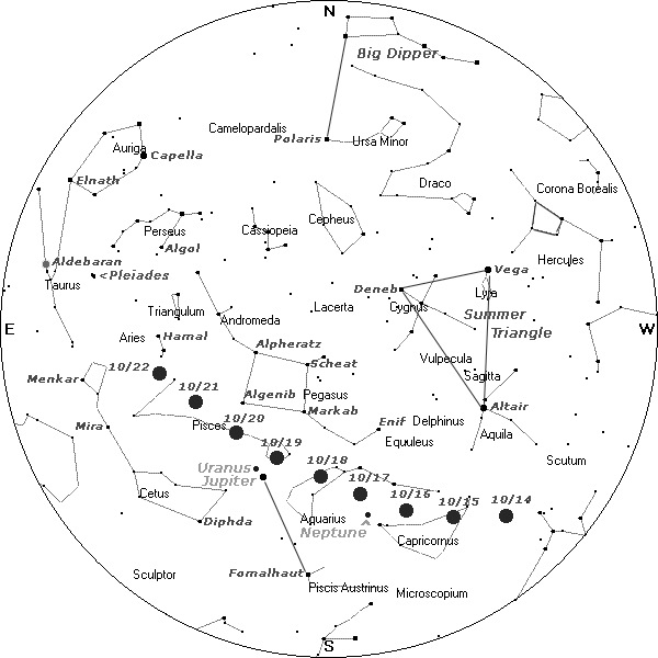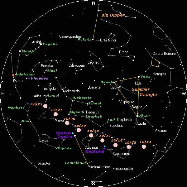 Note: Jupiter lies to the right of the October 22/23 Full Moon. See this map/text.