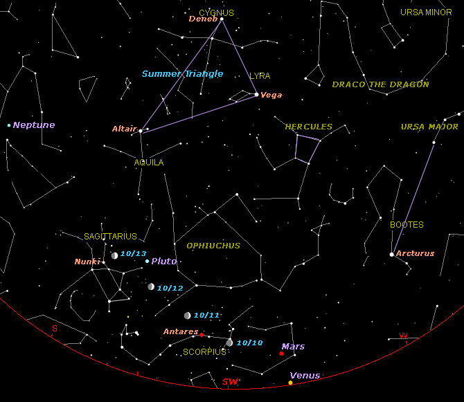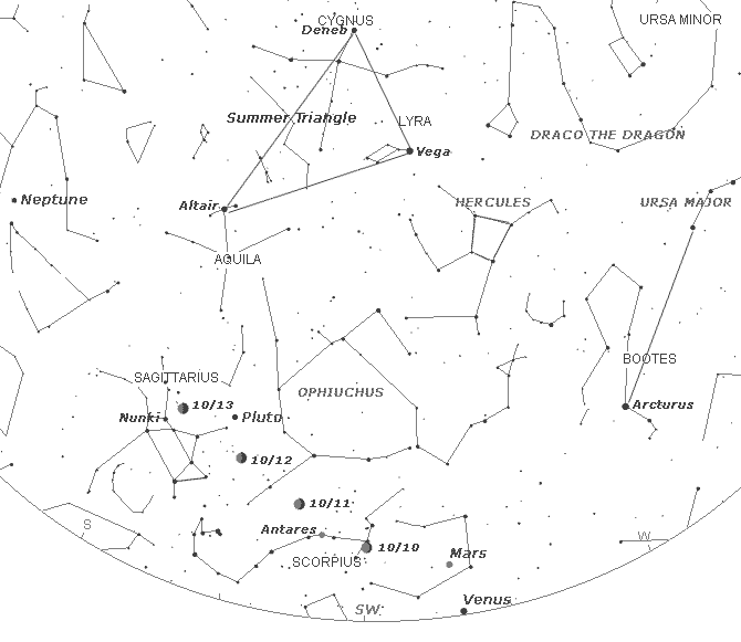 the Moon grows in the light provided by our Sun, Reflections ~ Waxing Crescent Moon Overcoming obstacles to the new incoming awareness begins with the waxing Crescent Moon. What was conceived at the New Moon, Winds of Change, Right Timing, Divine Vision, (review above) is now in the process of waxing or gestating. October 10-11, Sunday-Monday, waxing Crescent Luna leads us into the burning ground of Scorpius. Sunday look for the cosmic Scorpion's fiery red heart to the left of Luna and Monday to the lower right. Compare this 10/11 Map/Text with the map above. In the Scorpion's burning ground the evolutionary winds of change have us spiral dancing with death and new life. Scorpius presents us with tests and trials, while Antares demands we take a stand for the Truth. It is the Truth that sets us free to rise up like the Phoenix from the ashes. October 12-13, Tuesday-Wednesday, Luna introduces us to Sagittarius the Archer. Tuesday Luna lies above his arrow's tip and Wednesday above the vane. Telescopic Pluto is positioned above the top of the teapot asterism of Sagittarius. Review this constellation image and the map above. Use your imagination to mark the location point in our sky of the New Horizons Pluto-bound spacecraft – between Pluto and the top of the Archer's teapot. New Horizons was launched January 2006 and is scheduled to reach Pluto July 2015. This cosmic Archer with Pluto on his bow takes aim, zeroes in on the Light and Whole Truth and knows the way to go. His emanations illumine the useful intellect, allowing intuitive perception to see a new type of goal, one that unifies the dualities into a Divine ONE. The Archer teaches us to aim the arrow of the mind toward the intuition for divine vision and right timing. Call on Sagittarius when change is at hand.