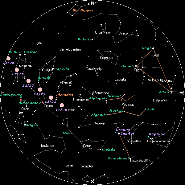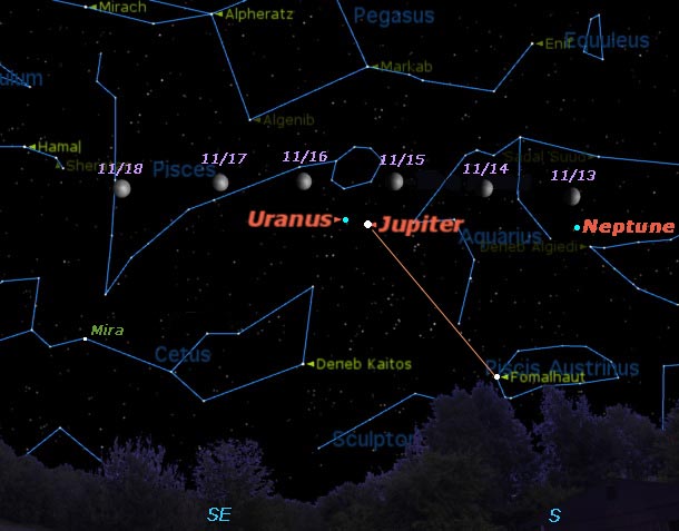 This nightly triangle is easily seen November 13-18. It is formed by Luna, Fomalhaut and Jupiter. Review map above.