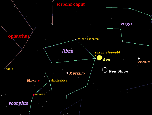 ~  New Moon With every New Moon our soul goes into meditation and aligns with the inspiration of the Nirmanakayas; a potential is enlivened and a seed of consciousness is formed deep within. Take some time to create a sacred space. A new cycle is beginning. The New Moon and Sun conjoin Libras two brightest stars Zubeneschamali and Zubenelgenubi.