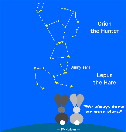 Find Three Rabbits in the Heavens! Moon Rabbit as shown above is always seen in the Full Moon. Lepus The Hare ~ the Cosmic Bunny is located below Orion's feet. He's easier to see in a dark country sky. Use this fun star map for orientation, then compare to this Easter 8:30pm Sky Chart. This cosmic bunny might just have an Easter Egg for you! Bunny's Footprints belong to a magical bunny and you can track these footprints in Scorpius throughout the year.