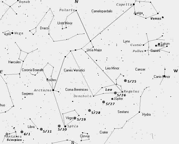 25  27  The growing Crescent Moon visits Leo the Lion. May 25 the Moon enters the constellation Leo and lies northwest of Regulus, the Lions heart. BTW: Comet NEAT is just to the right of the Moon and fades quickly after this night. May 26 the "almost" First Quarter Moon slides between Regulus and Jupiter and on May 27 the "just" Quarter Moon moves east of Jupiter to the Lions hindquarters near the star, Denebola. Mark your calendars; the Moon and Jupiter is always a special visual treat. This lunar phase signals a balance between the light and dark moving toward the light. Ideally obstacles impeding the growing new awareness are overcome now in order that the Full Moon energy can be utilized.