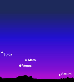 Saturn is sinking out of sight toward the setting Sun. The planet's low altitude and the solar glare make it challenging to see after the first week of September. Saturn sets in the beginning of Virgo at 9:00pm and at 7:45pm by its end. As Saturn drifts away from Venus and Mars toward our central luminary, a new sunset triangle forms. The trio consists of Venus, Mars and Spica, the brightest star of Virgo the Virgin. They can be seen to the left of Saturn, our Lord of the Rings. Use binoculars to view and fully appreciate the subtle hues of rouge-gold Mars, bluish Spica and yellowish Saturn.