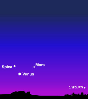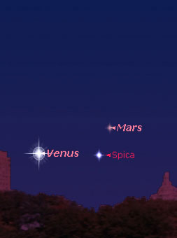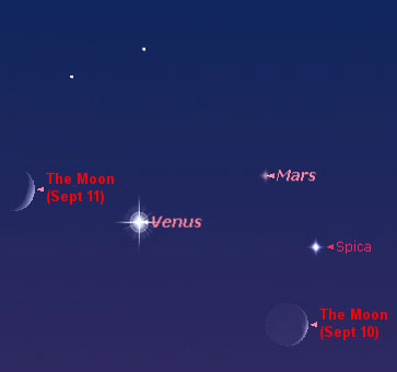 Sky Lights ~ Virgo August 22 - September 22 Mercury, as it switches from the evening to the morning sky, is hidden from our view by the bright light of the Sun. This elusive planet is in inferior conjunction 9/3 and reappears above the sunrise horizon around mid-September. Begin looking in the east before dawn as early as 9/13. The planet brightens with each new day and is at its best the morning of 9/19 when it is at greatest elongation and positioned below Regulus, the heart star of Leo the Lion. 9/19 Dawn Map Afterwards Mercury sinks back toward the Sun. Mercury rises in the east around 5:30am and remains close to the horizon until sunrise. Mercury is retrograde 8/20-9/12. Saturn is sinking toward the setting Sun and is challenging to see after the first week of September. The planet sets in the beginning of Virgo at 9:00pm and at 7:45pm by its end. Venus, Mars and Spica, the brightest star of Virgo the Virgin, lie to the left of Saturn. Saturn and Spica are equally bright at magnitude 1.0. 8/23 Dusk Map ~ 8/31 8pm Map Saturn's telescopic rings are tilting open, revealing more and more of their northern face. Generate images of Saturn's ring tilt as seen from Earth with the Solar System Simulator. Venus and Mars pair up near Spica, the brightest star of Virgo the Virgin. Look low on the west-southwest horizon soon after sunset. Both planets are sinking in altitude, setting around 9:30pm at the beginning of Virgo and at 8:30pm by its end. Venus is moving closer to Earth growing bigger and brighter, while Mars is moving away and diminishing in size and brightness. Venus at magnitude -4.7 pierces the twilit sky and brilliantly blazes in a dark sky until it disappears below the horizon. Dim Mars at magnitude 1.5 can only be seen as the sky darkens. The planets' star companion, blue-white Spica, at magnitude 1.0 is only a little brighter than our Red Planet. 8/23 both Venus and Mars lie between Saturn and Spica. Binoculars make vivid the hues of rouge-gold Mars, bluish Spica and yellowish Saturn. 8/23 Dusk Map 8/31 Venus moves further left of Mars below Spica; Saturn now lies to their far right. 8/31 8pm Map 9/5 Mars lies above Spica with Venus to their left. 9/5 8pm Map 9/10+11 the young Moon joins the 2 planets and star; get out those binoculars to fully enjoy the show; challenging to see Saturn lies to their far left. 9/10+11 Map 7:45pm Venus is at its greatest brilliancy 9/23. 9/23 7:30pm Map Venus has phases like the Moon; you can see them and more in this Venus 2010 Animation. As Venus gets closer to Earth and bigger in disk size its illuminated phase decreases; during Virgo Venus wanes from a 48%-27% illuminated Crescent. You can see this demonstrated in APOD's animation of the phases of Venus. Jupiter is at its very best for 2010 during September, reaching opposition 9/21, when it is seen from sunset to sunrise. At this opposition the planet lies closer to Earth than it has in 47 years, resulting in its appearance being bigger and brighter than it has been in a long time. Jupiter rises in the east at the beginning of Virgo at 9:00pm and by its end at 7:00pm. The planet travels high above the southern horizon as the night progresses, sinking low in the west around sunrise. Jupiter at magnitude -2.9 is the brightest point of light in the morning sky and in the evening sky after Venus sets. During Virgo, in the dim constellation of Pisces, Jupiter pairs up with Uranus, which at magnitude 5.7 is now easily seen with binoculars and without an optical aid in a dark sky. Uranus and Jupiter are in exact conjunction Sept. 18/19; 9/21 Uranus reaches opposition 5 hours after Jupiter. 8/26 look for the waning Gibbous Moon near Jupiter. 8/26 11:30pm Map 9/23 there's an encore performance with the Harvest Full Moon near Jupiter. 9/23 9pm Map Jupiter is retrograde 7/23-11/17.