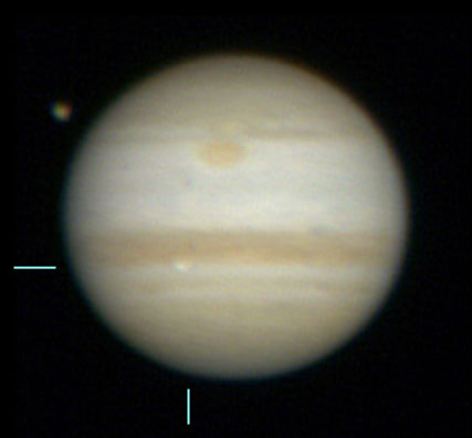 Jupiter and the Moon August 24-27 large Luna is a delight near Jupiter. 8/24-27 9:30pm Sky Chart August 26 waning Gibbous Luna and Jupiter are at their closest approach. 8/26 11:30pm Map Click Moon Dances for meditative reflections and an additional sky map. September 23 an encore lunar performance brings the Harvest Full Moon in close proximity to Jupiter. 9/23 9pm Map Jupiter and Uranus Jupiter lies in the dim constellation of Pisces and pairs up with Uranus, which at magnitude 5.7 is now easily seen with binoculars and without an optical aid in a dark sky. Jupiter's retrograde motion 7/23-11/17 is moving it westward, back toward Uranus. Uranus and Jupiter are in exact conjunction September 18 at 6:07pm (01:07 UT 9/19). As a result, Uranus reaches opposition just 5 hours after Jupiter, so both planets are at peak visablity all night long September 21. Telescopic Jupiter Viewing Jupiter with a telescope promises to be an adventure. Any size telescope will reveal Jupiter's missing South Equatorial Belt or perhaps the "SEB Revival" ... the night the stripe returns! In addition seeing nearby Uranus with a telescope or binoculars is a special 2-for-one planetary treat! Both planets, growing in size as they near Earth, also lend themselves to better observations. The four Galilean Moons, the largest and brightest satellites of Jupiter can be seen in a dark country sky with binoculars. They appear starlike on either side of the planet. With a telescope you just might see one of these cast a shadow on the Jovian cloud tops. Jupiter’s