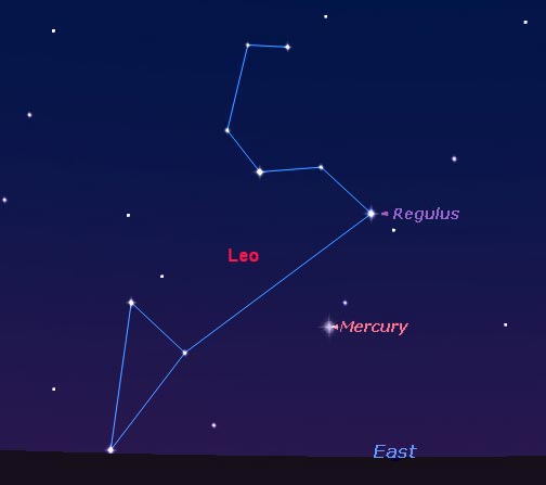 Mercury, as it switches from the evening to the morning sky, is hidden from our view by the bright light of the Sun. This elusive planet reappears above the sunrise horizon around mid-September. Begin looking in the east before dawn as early as September 13. Mercury rises in the east around 5:30am and remains close to the horizon until sunrise. The planet positioned below Regulus, the heart star of Leo the Lion, brightens with each new day. However, after achieving greatest elongation September 19, it begins to sink back toward the Sun. When Mercury begins to leave the evening sky it appears to move backwards among the stars, to the west instead of to the east. This westerly motion is called a retrograde. Mercury is retrograde August 20 - September 12. When leaving the evening sky, Mercury sinks into the light of the Sun and exactly conjoins the Sun in inferior conjunction September 3. This conjunction marks the planet's transition from the evening to the morning sky and the mid-point of its retrograde. The planet ascends out of the solar glare and reappears in the morning sky in mid-September. Mercury halts its 21-day retrograde motion September 12 when it is stationary direct at 4:09pm PDT (23:09 UT).