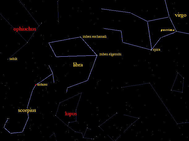 Wesak's Full Moon Location The Wesak Full Moon, at the time of its exact fullness, is always positioned in the constellation of Libra the Balance. Libra was once a part of two constellations, Scorpius and Virgo. The map below shows these 3 constellations. During the time of Julius Caesar the Romans created Libra as the twelfth constellation to represent Roman justice. They made the two bright Zuben stars, the two pincer claws of Scorpius (Chelae in this image), into the arms of Libra the Balance. Libra was once considered the scales of the goddess of Justice, which Virgo the Virgin represented.