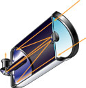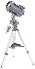 More on GO TO Catadioptric Telescopes A new telescope and a crystal-clear dark sky what more could the amateur astronomer want? But often the outcome is frustration when it proves difficult to find stars, planets or other astral objects in the lens. The positions of objects in the sky are pinpointed using the skys equivalent of longitude and latitude, called right ascension and declination. Equatorial-type telescope mountings have dials, called setting circles, that carry these scales. The problem is, that because of the Earths daily rotation, the direction of a given right ascension is changing all the time and the direction of a given declination depends on the location of the telescope on Earth. Before an equatorial mounting can be used, it must be aligned so that one axis is exactly parallel with the Earths axis, which takes time and care. Then the setting circles must be set up for that particular time of observation. This must be repeated each time you set up the telescope. Many people with portable instruments prefer to find objects by star-hopping, but if you do not know the night sky very well, this can be difficult as well. Even aligning the spotting scope with the main scope can get a bit meticulous at times. There are now computer-controlled mountings which do away with all this fiddling. These mountings have optical encoders on their axes, which give a digital readout of which direction the telescope is pointing. They are also equipped with purpose-built computerized handsets that are pre-programmed with the positions of thousands of celestial objects. To find an object, all the user has to do is to be able to recognize two bright stars in the sky. The telescope is pointed at each one in turn, and the identity of the star is entered on the handset. Since any two stars are in unique directions at a given time and place on earth, the computer can work out the position of any other object in the sky and will move the telescope to it on command. To find a planet, you have to key in the date as well. A computerized mounting does not even need to be aligned with the Earths axis. It will track a chosen object even if it is not equatorially mounted, although this is still necessary for taking long-exposure photographs.