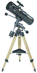 Telescope Mounts A quick word about telescope mounts. Telescopes come on three basic mounts: altazimuth, Dobsonian, or equatorial. The altazimuth is the simplest type of mount, providing up-down, left-right motions and is recommended for casual stargazing and terrestrial viewing. The Dobsonian mount is a boxy altaz-type mount that sits close to the ground and was designed for easy maneuvering of large reflectors or Newtonian tubes of 6" or greater. Equatorial mounts are a bit more complicated (and more expensive) than the altazimuth mounts and are designed solely for astronomical viewing. They are tilted, with one axis aligned on the celestial pole. These type of mounts allow the user to track or follow the motion of celestial objects through the sky with a single manual hand control, or automatically with a motor drive~a great convenience. Most telescopes come with a sturdy mount and a tripod to bring the eyepiece up to eye level, (beware of "tabletop" telescopes that look cute in ads but require an expensive, optional tripod to be practical).